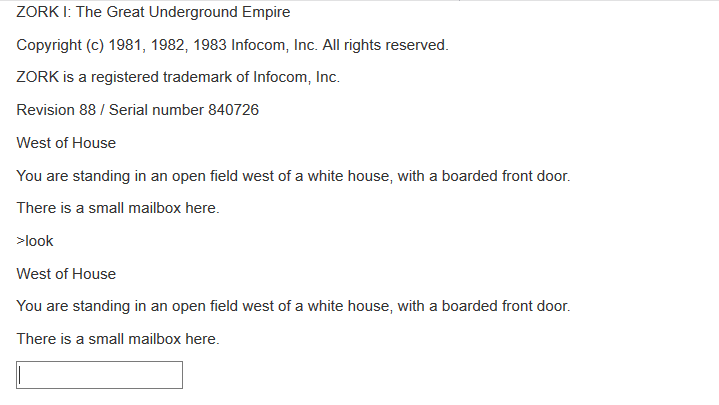 Zork is a text based piece of interactive fiction made by Infocom. Zork is inspired by Collosal Cave a game written in Fortran for DEC computers. Selling games for DEC computers didn't make a lot of sense, so Infocom decided to create a virtual machine called ZMachine. This ZMachine would let them use the same code (image) across multiple platforms. Back in the day these platforms were personal computers like the C64, IBM, Apple II and lots of others.